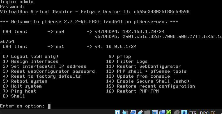 - Carte 2 (em1) : LAN - intnet - 10.0.0.1/24